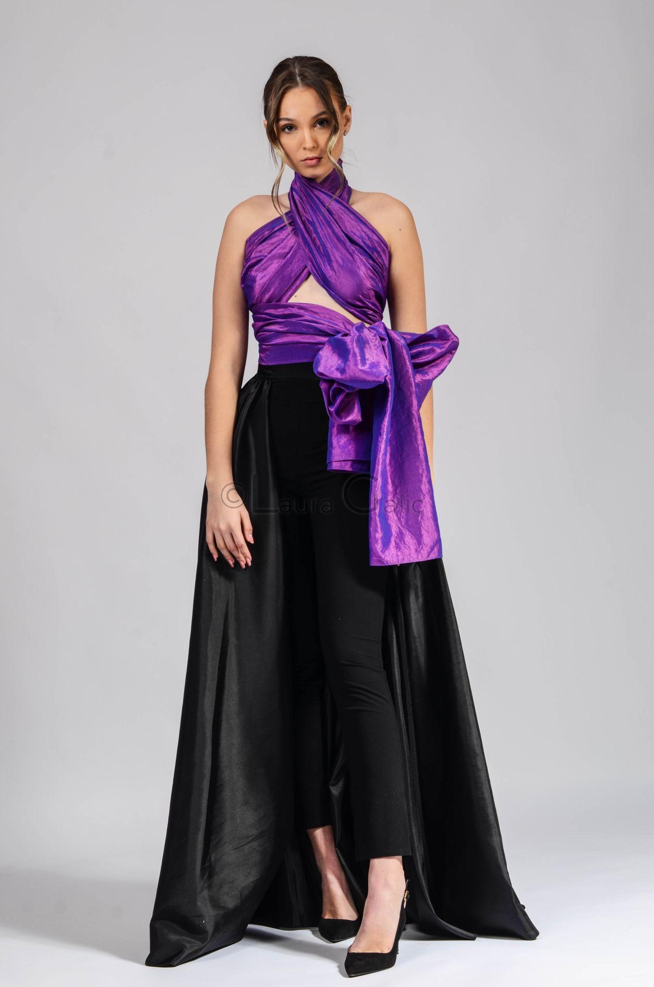 Compleu Aniela 3, pantaloni stofa lina, trena detasabila tafta cu inchidere fermoar spate, esarfa tafta prinderi multiple