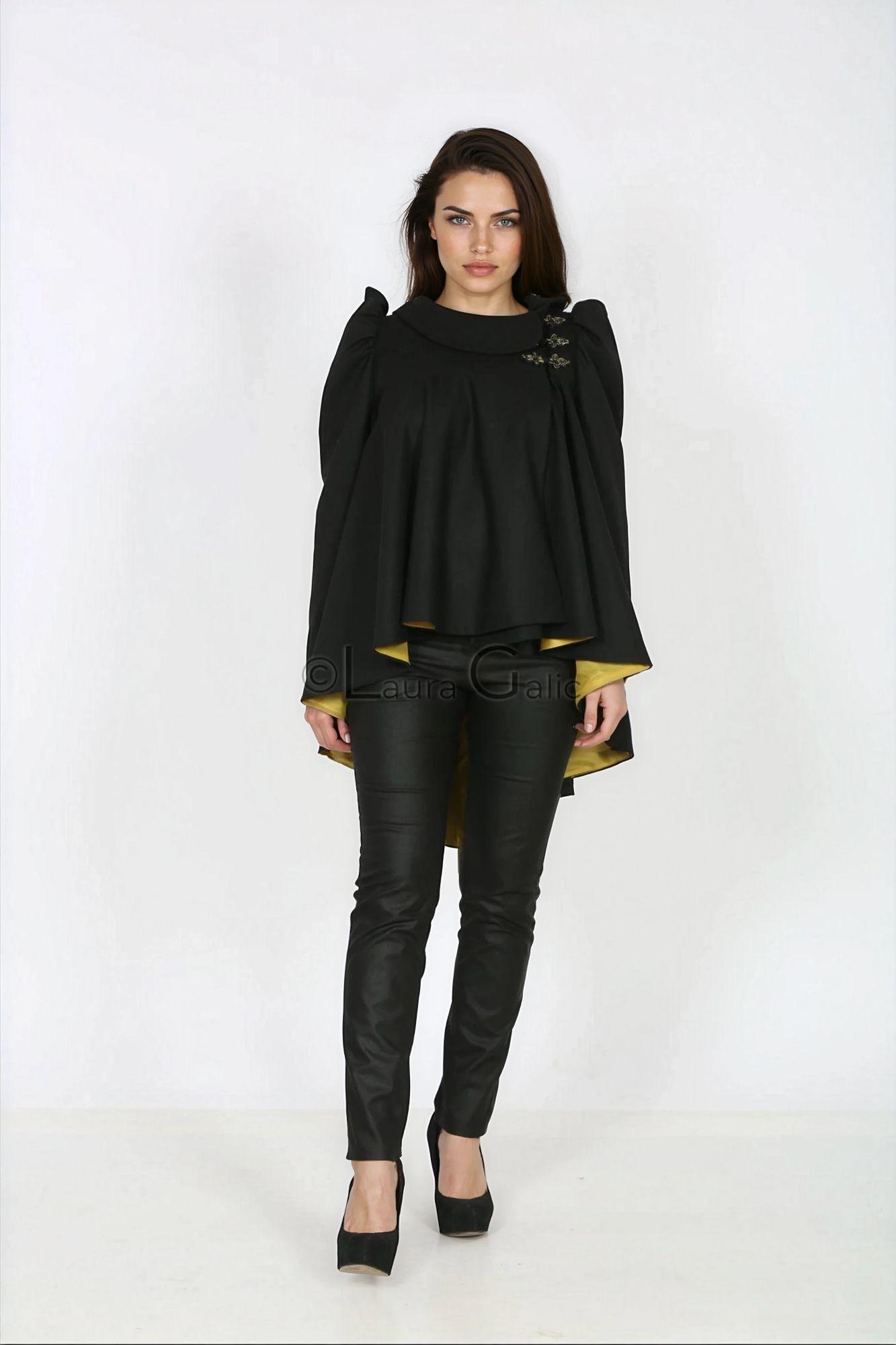 Palton Cora, trench primăvară/toamna, capa eleganta, mâneci bufante, prindere nasturi chinezești , stofe lina culori la alegere