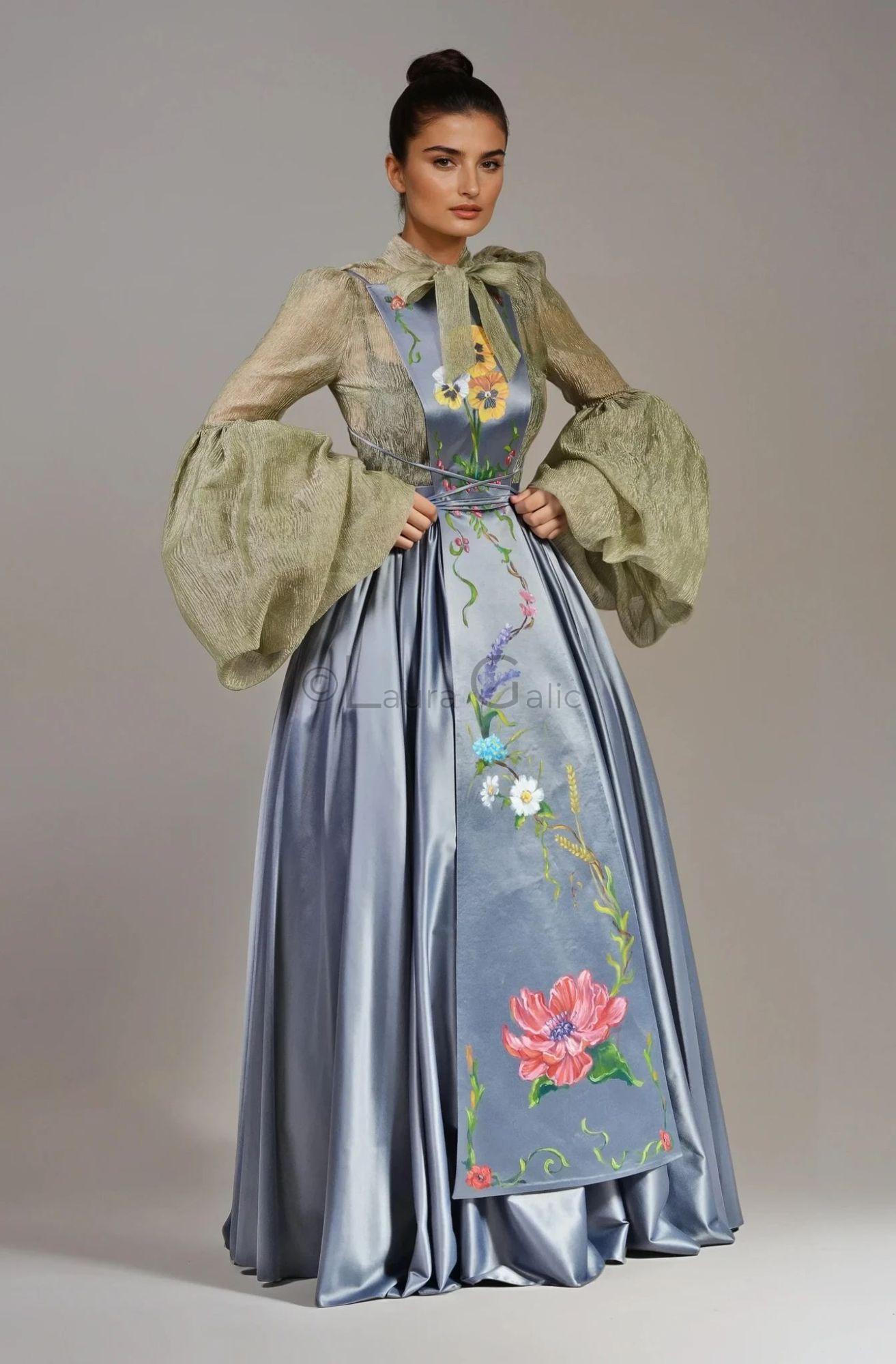 Compleu pictat 3 piese (Compleu 3 piese, camasa organza naturala bumbac si mătase Luana 3, fusta tafta de bumbac satinat, fermoar spate, Catrinta pictata unicat, flori si nuante la alegere)