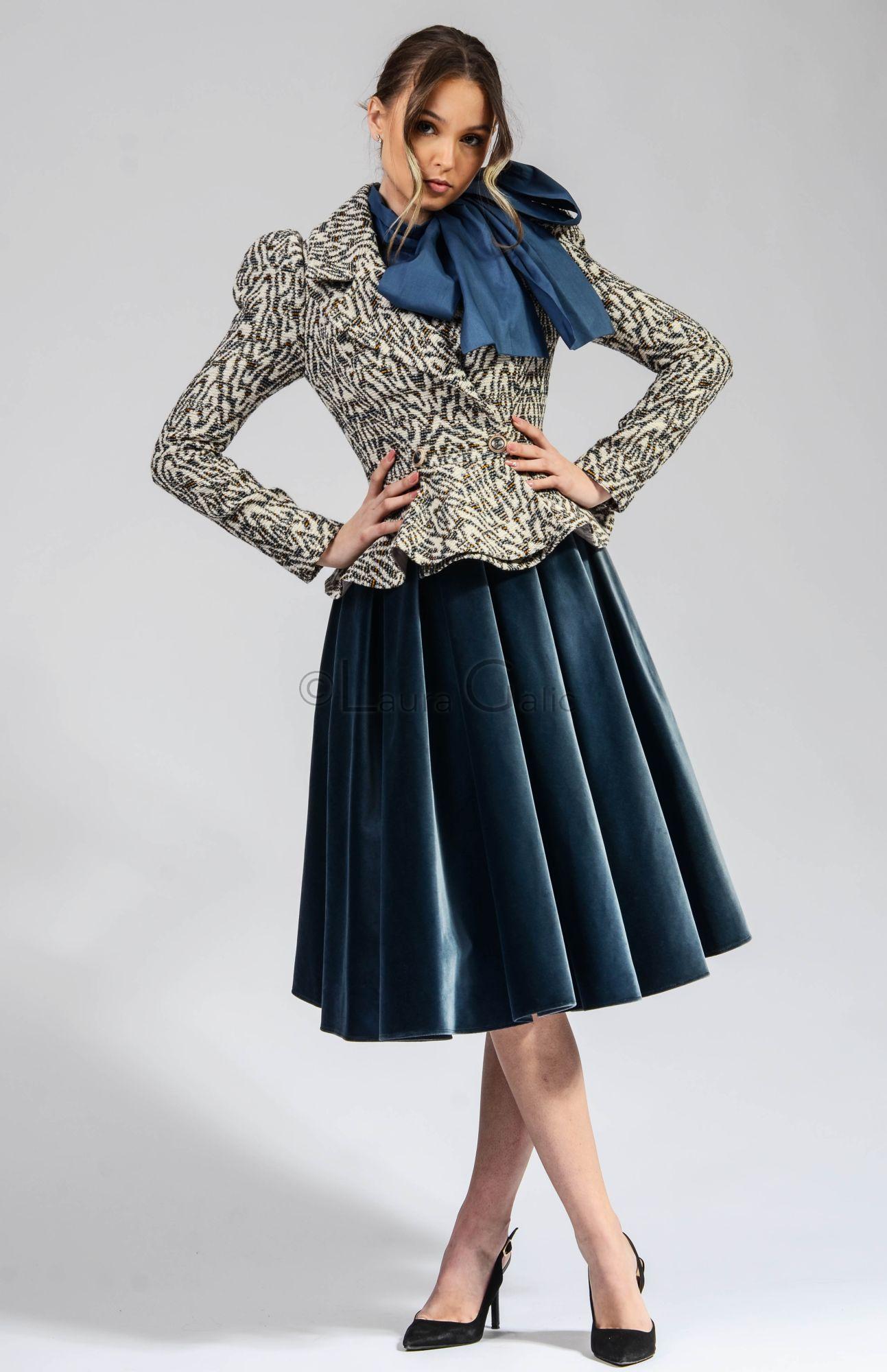 Costum 3 piese Carmen 7 din lina, cu fusta Marisa din catifea de bumbac, stofa impletita editie limitata, trandafir detasabil, camasa bumbac