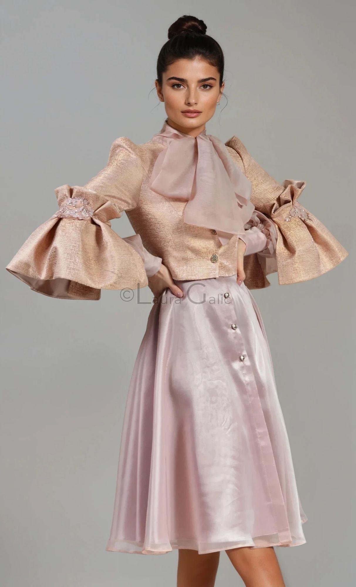 Costum Federica 4 peach cu Rochie Luana (Costum Federica 4 peach, stofa brocard tesut fir stralucitor, Rochie Luana midi, organza , maneci supradimensionate, aplicatii margele si perlute)