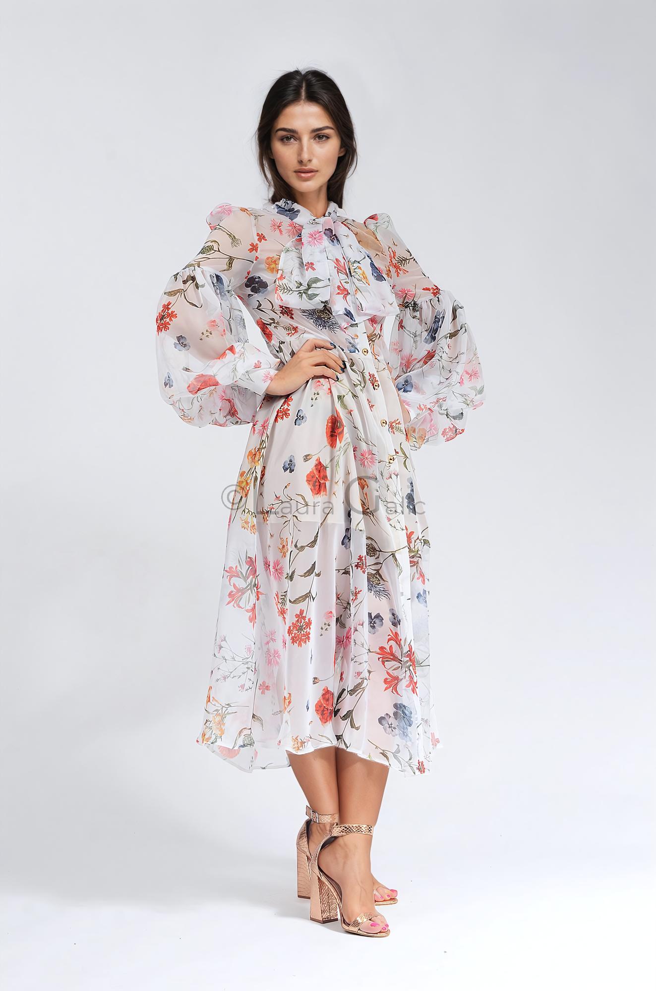 Rochie Luana, voal organza floral, închidere nasturi fata, manșete late nasturi, eșarfă prindere gât, cu jupa, fit lejer