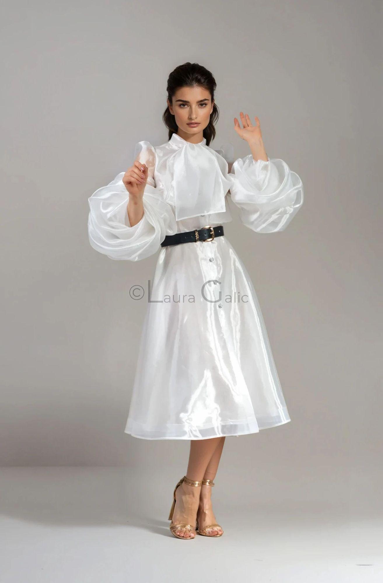 Rochie midi Luana bridal, organza, închidere nasturi fata, manșete supradimensionate trandafir, eșarfă prindere gât, cu jupa fusta si bust, fit lejer, culori la alegere