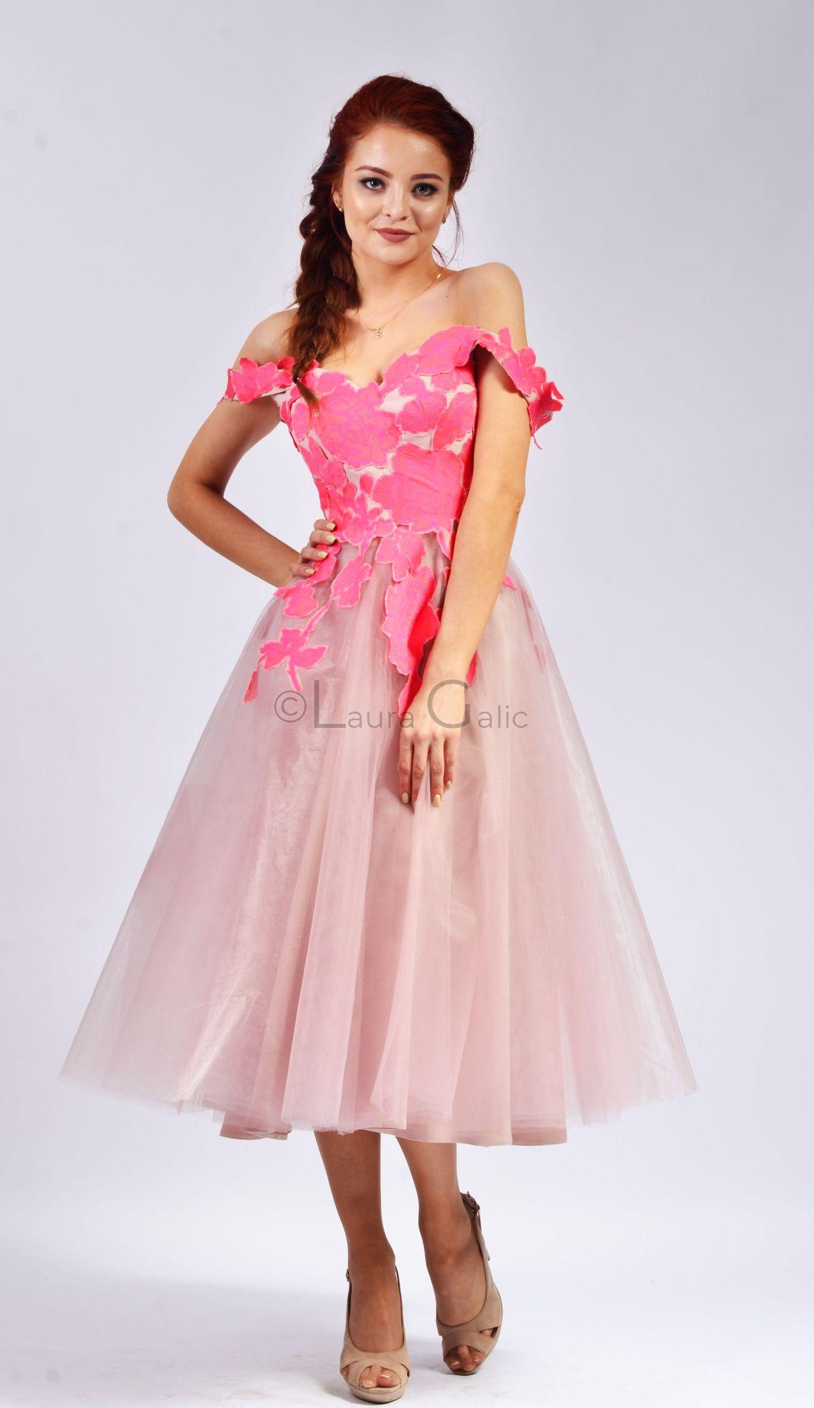 Rochie Delicată cu Mâneci Căzute și Fusta Midi din Tulle