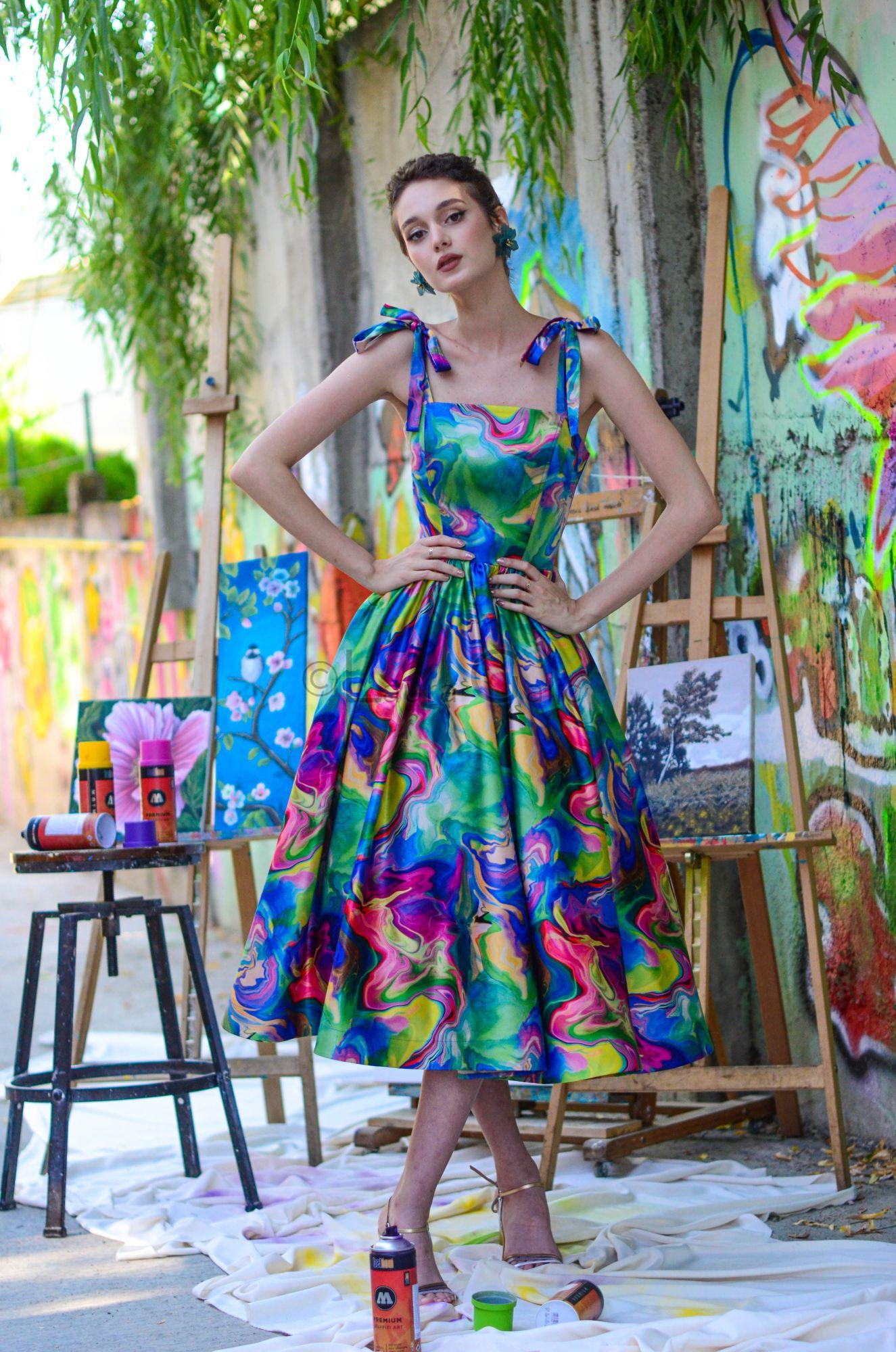 Rochie midi tafta satinata bumbac imprimat, Jupa tulle