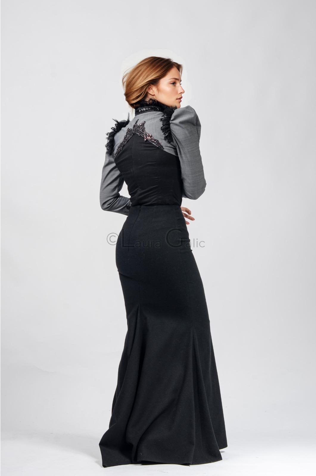 Sacou Lilith (Sacou Lilith, stofa lina subtire, guler tunica detalii datela si margele, umeri supradimensionati cu detalii dantela neagra si pene, spate si mansete cu dantela paiete, inchidere brandenburg)